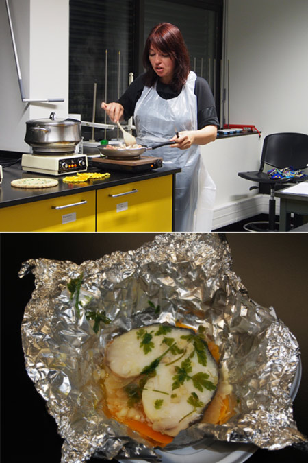 Fomos então encaminhados para uma espécie de laboratório/cozinha, qual aula de ciência aplicada, onde pudemos assistir e aprender como cozinhar alimentos com melhorados níveis de controlo sobre a utilização do sal, água e energia na confecção de alimentos, exemplos tais como: .. cozinhar alimentos com menos água usando o vapor para potencializar a cozedura, realçando assim as características dos alimentos e reduzindo no uso do sal. Permitiu-nos ainda que ao provar os alimentos ali confecionados à nossa frente, pudéssemos verificar que para além de bem cozinhados e de óptimo sabor, tivessem a quantidade de sal considerada suficiente.[…]